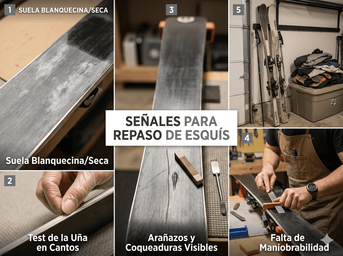 Si la base de tu esquí ha perdido su color negro brillante y se ve grisácea o con zonas blancas, la cera ha desaparecido. Una suela seca no solo desliza menos, sino que se vuelve vulnerable a las abrasiones y se degrada más rápido.